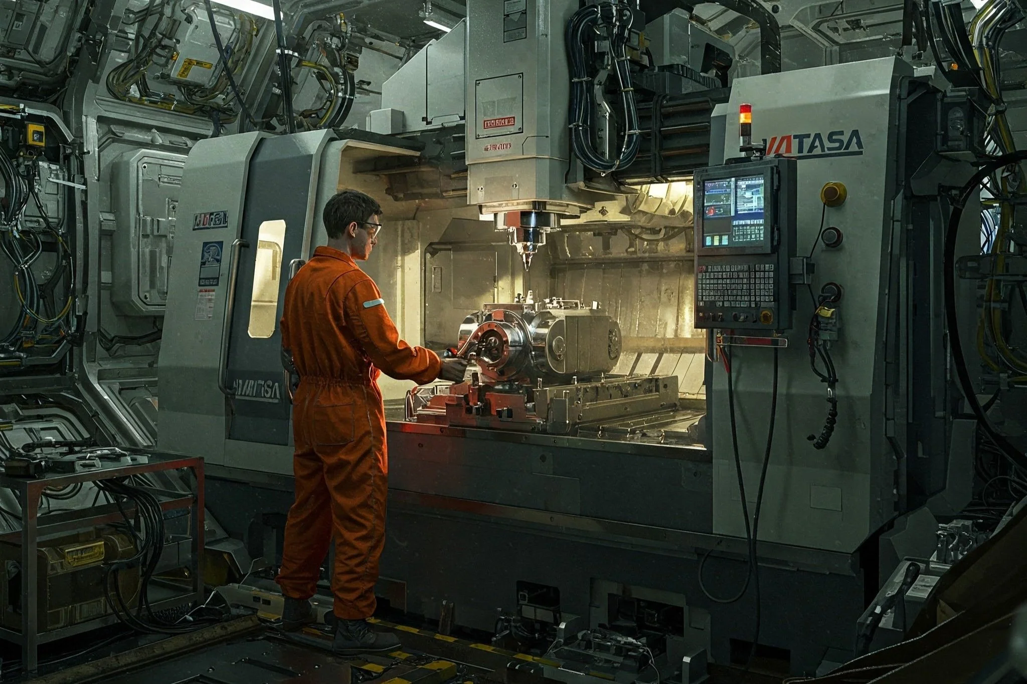 In-Situ Resource Utilization— A CNC operator supervises the milling of a block of aluminum derived from lunar regolith. This production facility was delivered to the Moon by a heavy lander and then covered with regolith to protect occupants from cosmic radiation. Production facilities such as this focus on simple, high-mass components, while advanced parts (i.e. servos and microprocessors) are sent from Earth… for now.