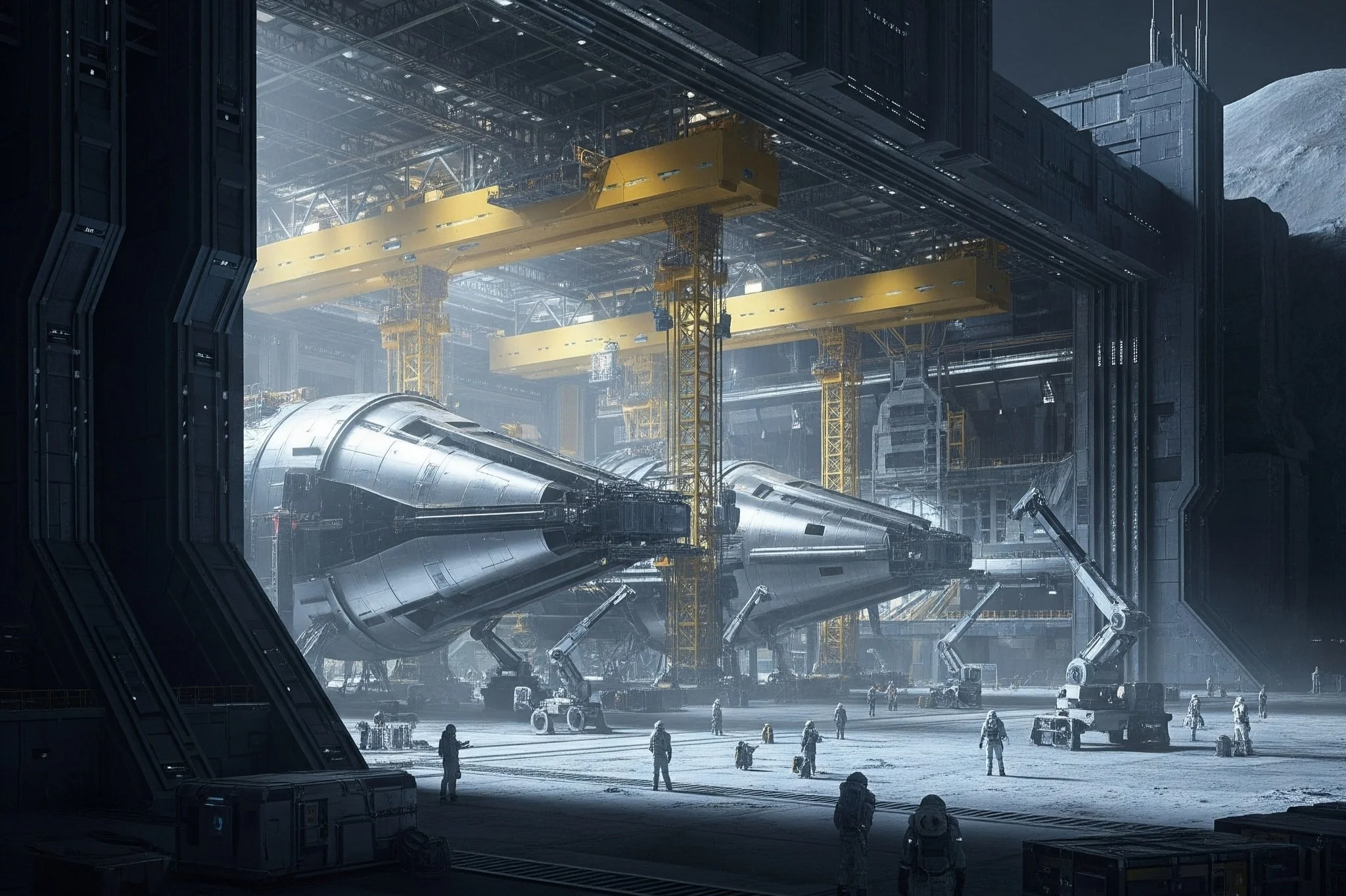 The Moon That Launched A Thousand Ships— The Moon becomes humanity’s gateway to rest of the solar system. At this shipyard, several interplanetary spacecraft are completed each day.