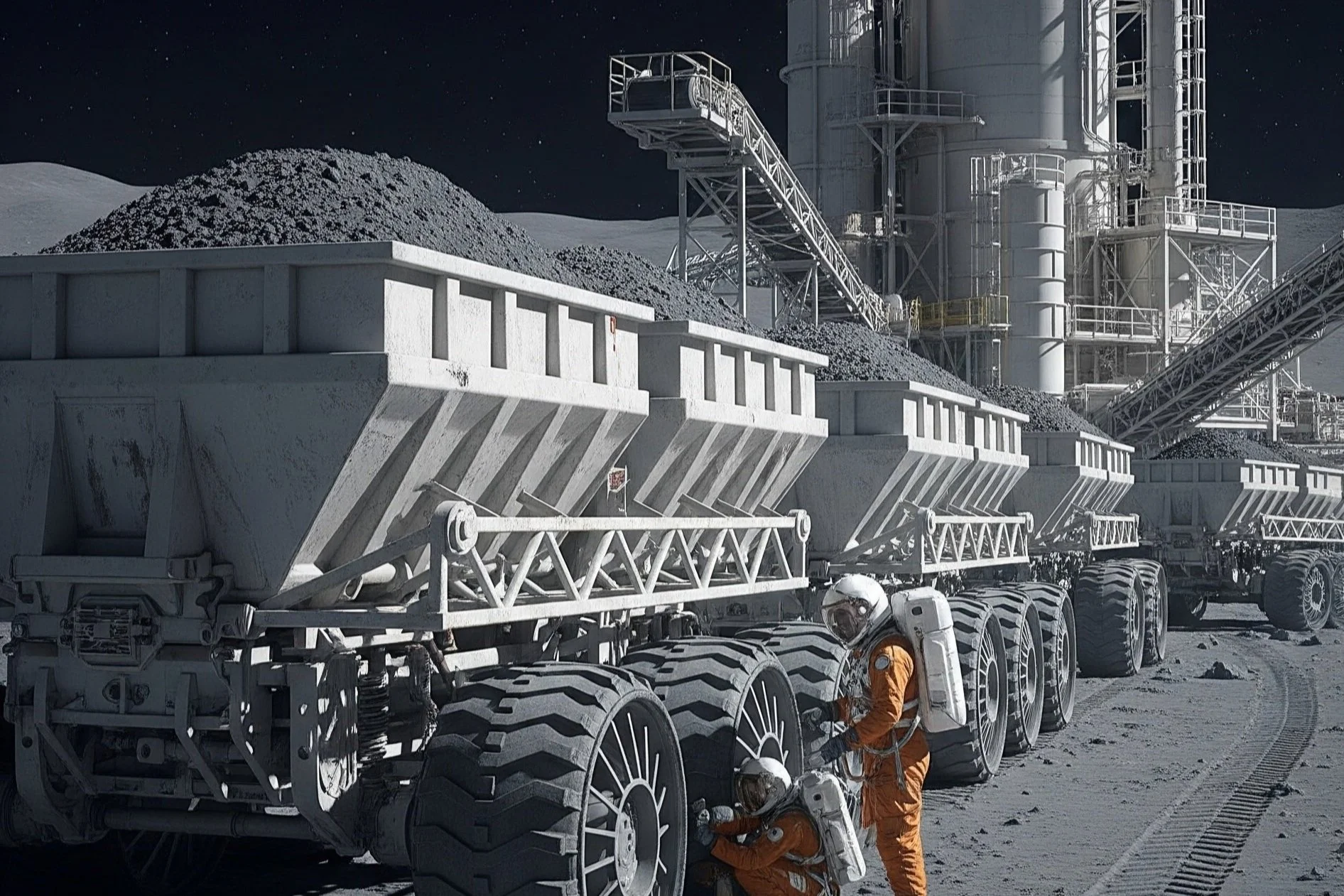 Mining— A maintenance team inspects the drivetrain of an autonomous regolith hauler. These vehicles operate around the clock to supply refineries with regolith feedstock. Lunar machinery is designed to be simple to make, robust, and easily repairable.